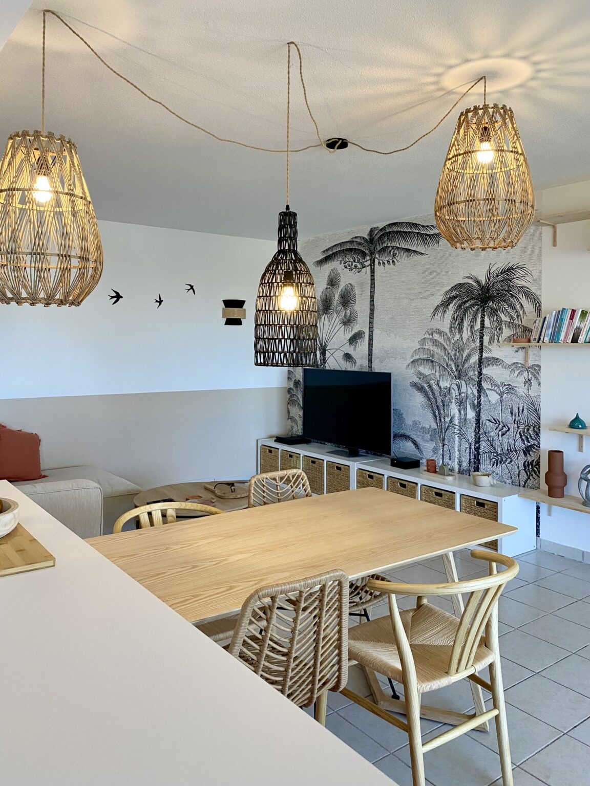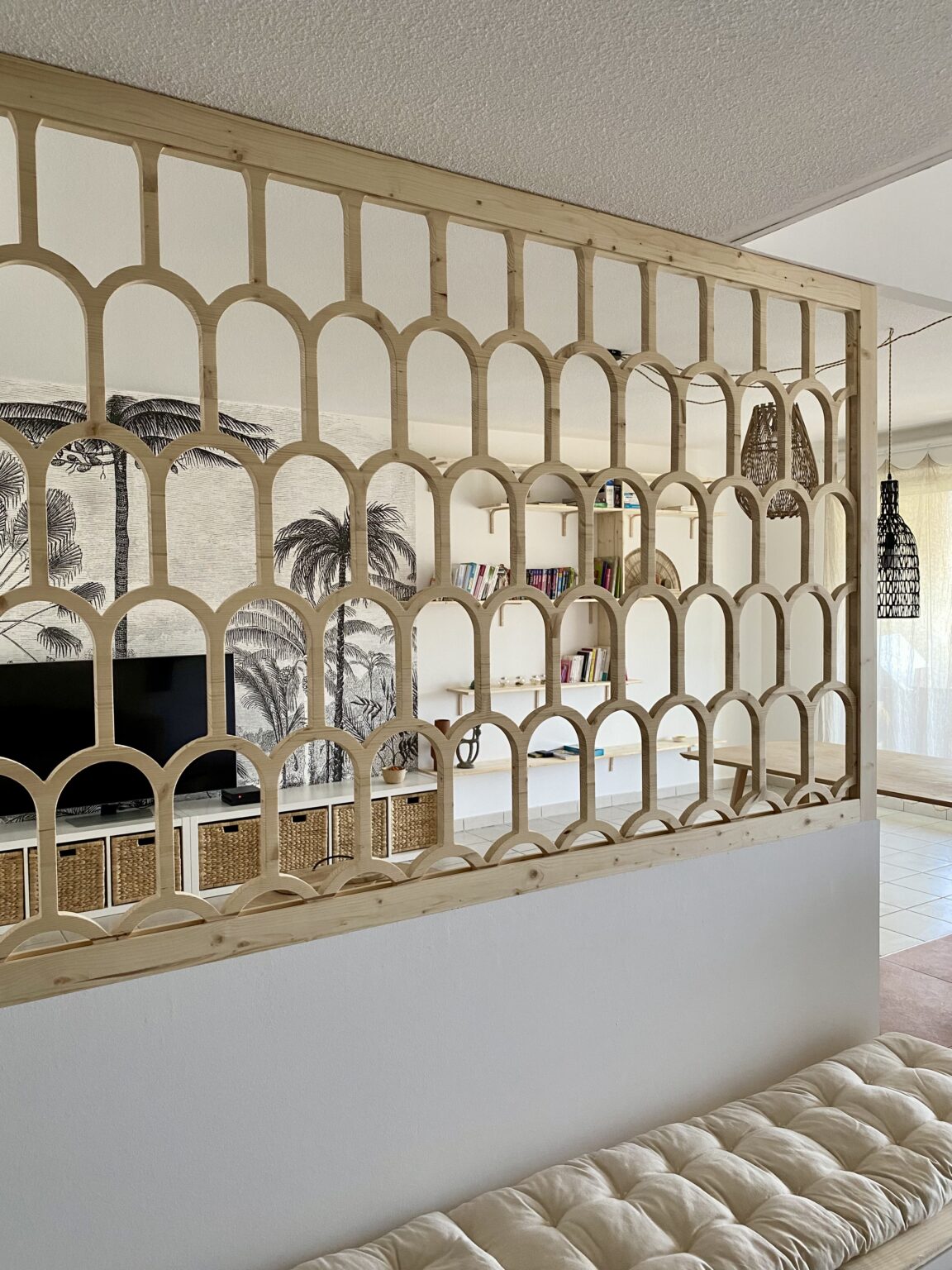Ce projet illustre la transformation d’un intérieur standard en un cocon boho-chic où la fluidité est le maître-mot. Grâce à une sélection de matières organiques (rotin, bois clair, fibres) et un budget parfaitement maîtrisé, nous avons redonné du caractère à l’espace sans travaux lourds. La création d’un claustra sur-mesure et l’utilisation d’un panoramique mural permettent de sectoriser le salon pour plus d’intimité, tout en préservant une luminosité naturelle et une circulation fluide entre l’entrée, la cuisine et le coin repas.