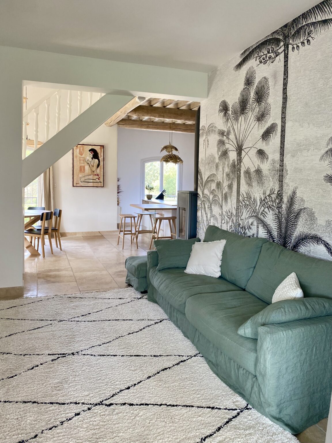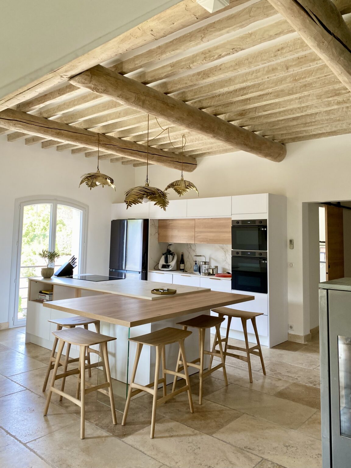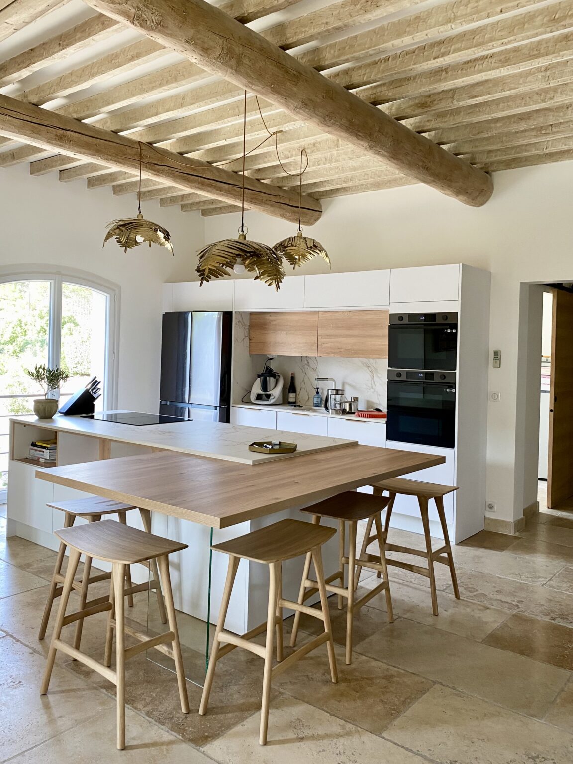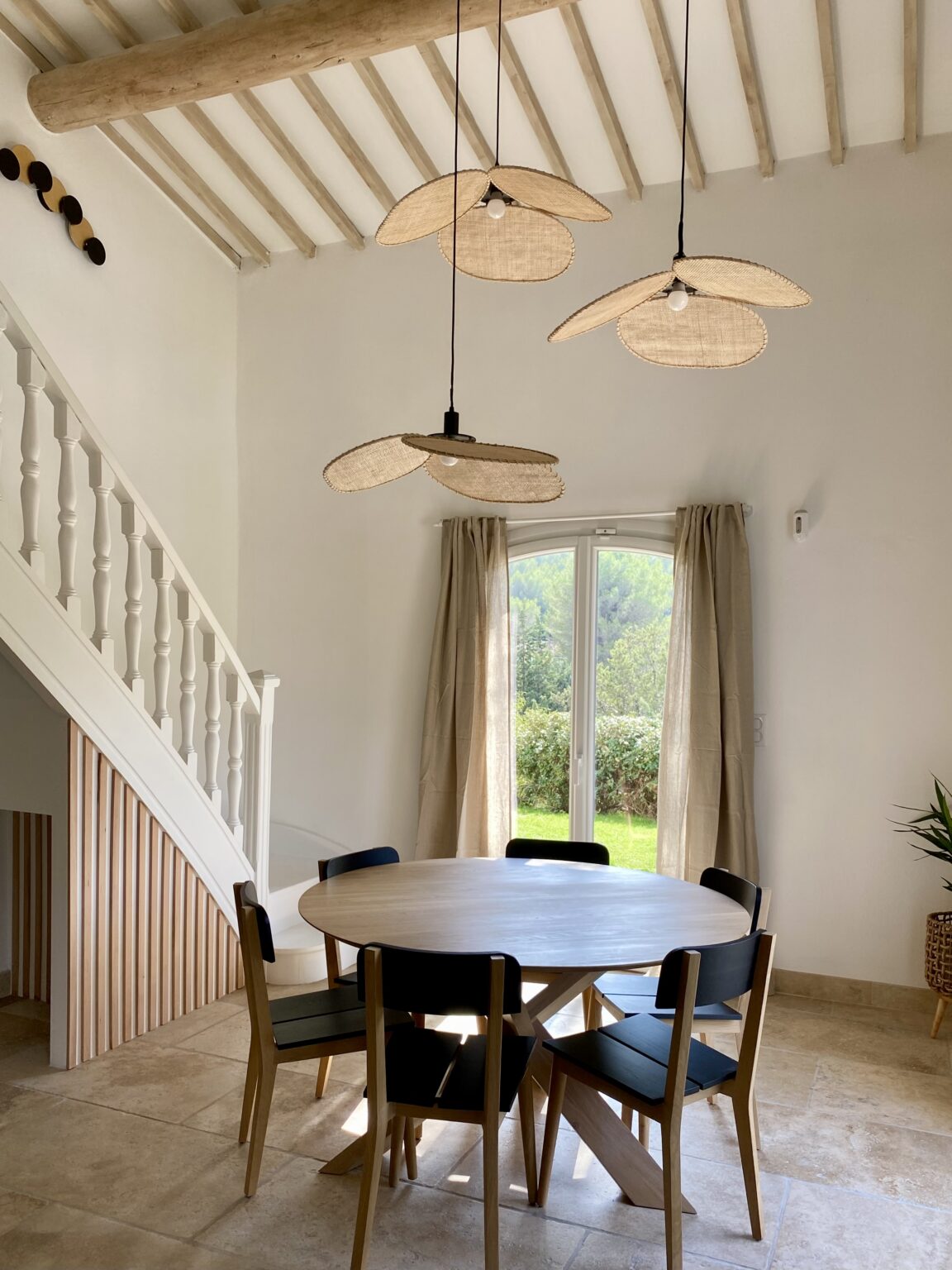 Ce projet de rénovation transforme une bâtisse rustique en une résidence « soft minimal » pour des clients expatriés de retour du Canada, désireux de vivre un esprit de vacances au quotidien. La création de la cuisine s’impose comme le cœur battant du foyer, mêlant un îlot blanc épuré à la chaleur du bois sous des poutres d’origine restaurées. La décoration décline un fil conducteur méditerranéen via une palette organique (sable, blanc cassé) et des matières naturelles comme le rotin, le lin et le travertin. Enfin, la rénovation de la salle de bain achève cette métamorphose en un havre de détente moderne.