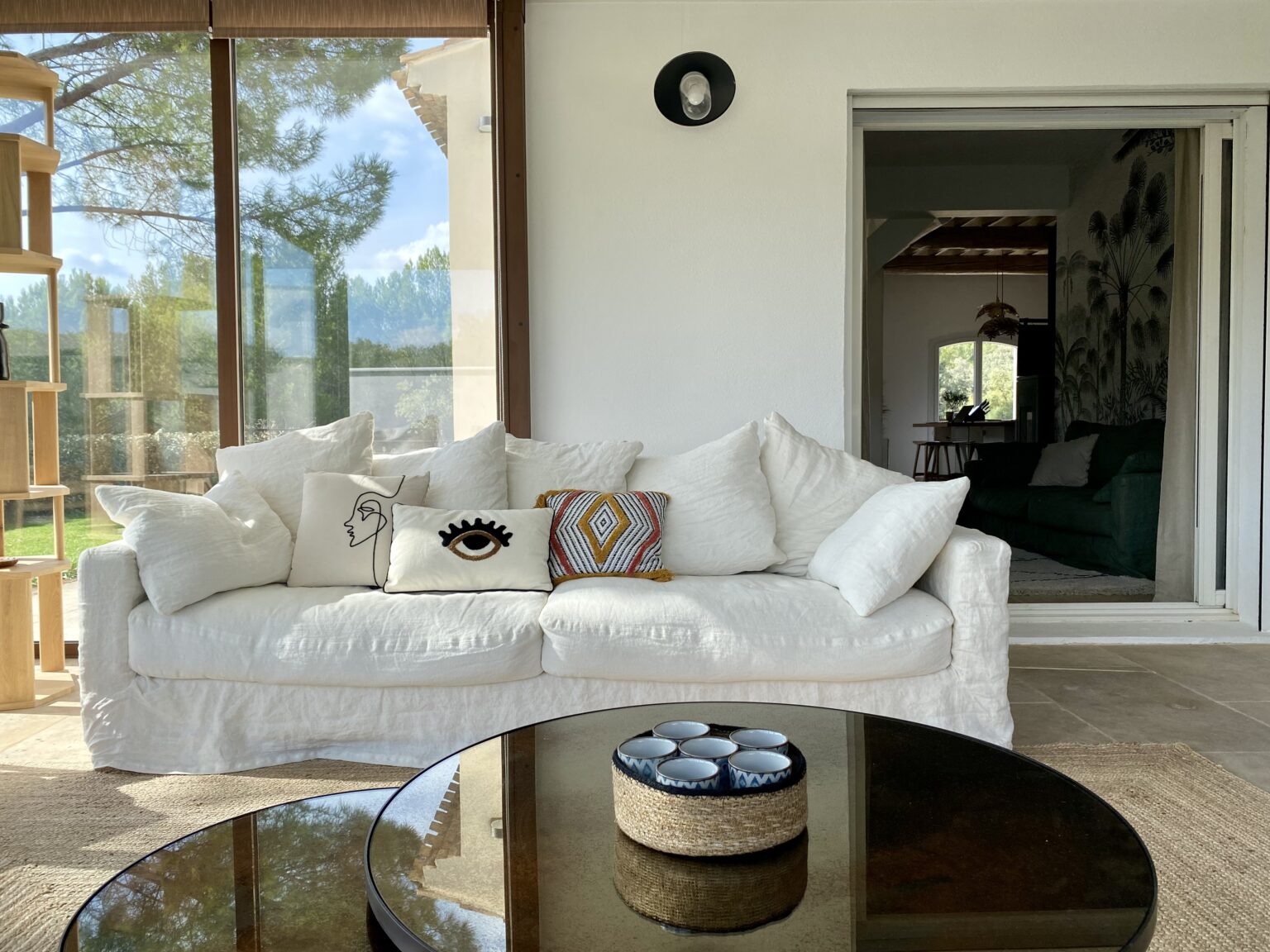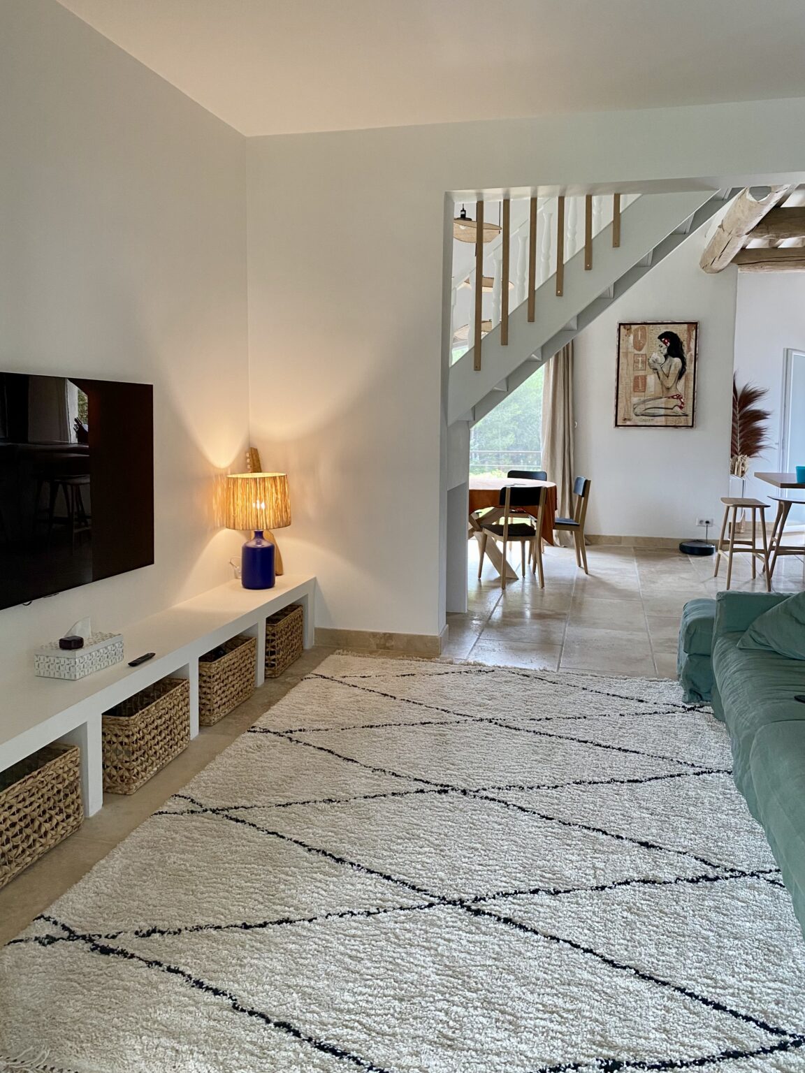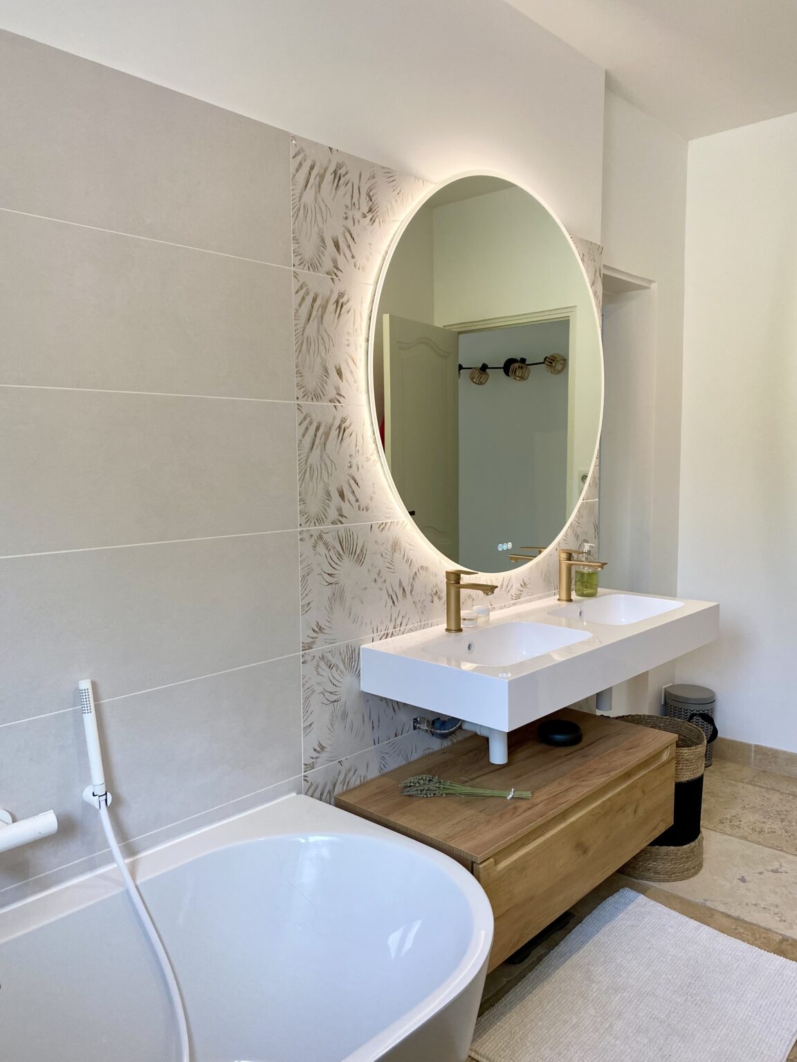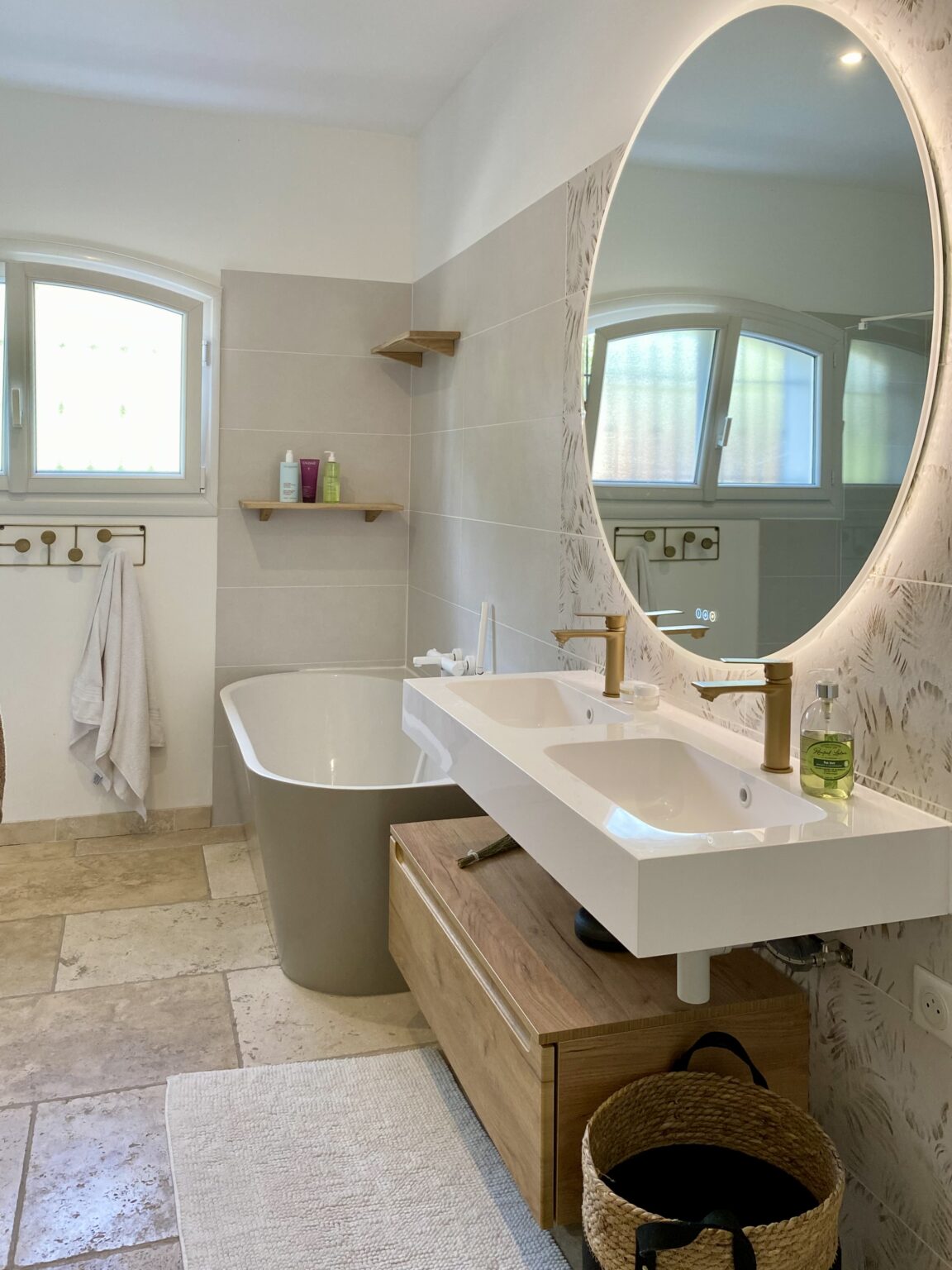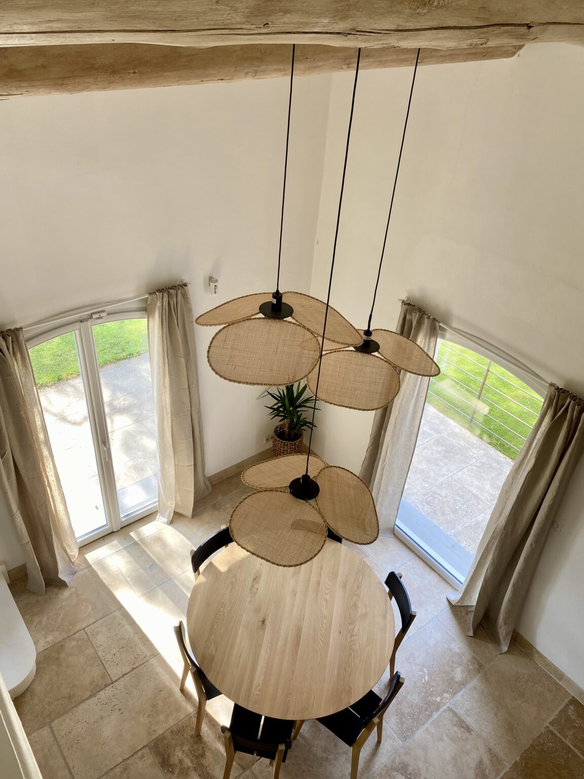 Ce projet de rénovation transforme une bâtisse rustique en une résidence « soft minimal » pour des clients expatriés de retour du Canada, désireux de vivre un esprit de vacances au quotidien. La création de la cuisine s’impose comme le cœur battant du foyer, mêlant un îlot blanc épuré à la chaleur du bois sous des poutres d’origine restaurées. La décoration décline un fil conducteur méditerranéen via une palette organique (sable, blanc cassé) et des matières naturelles comme le rotin, le lin et le travertin. Enfin, la rénovation de la salle de bain achève cette métamorphose en un havre de détente moderne.