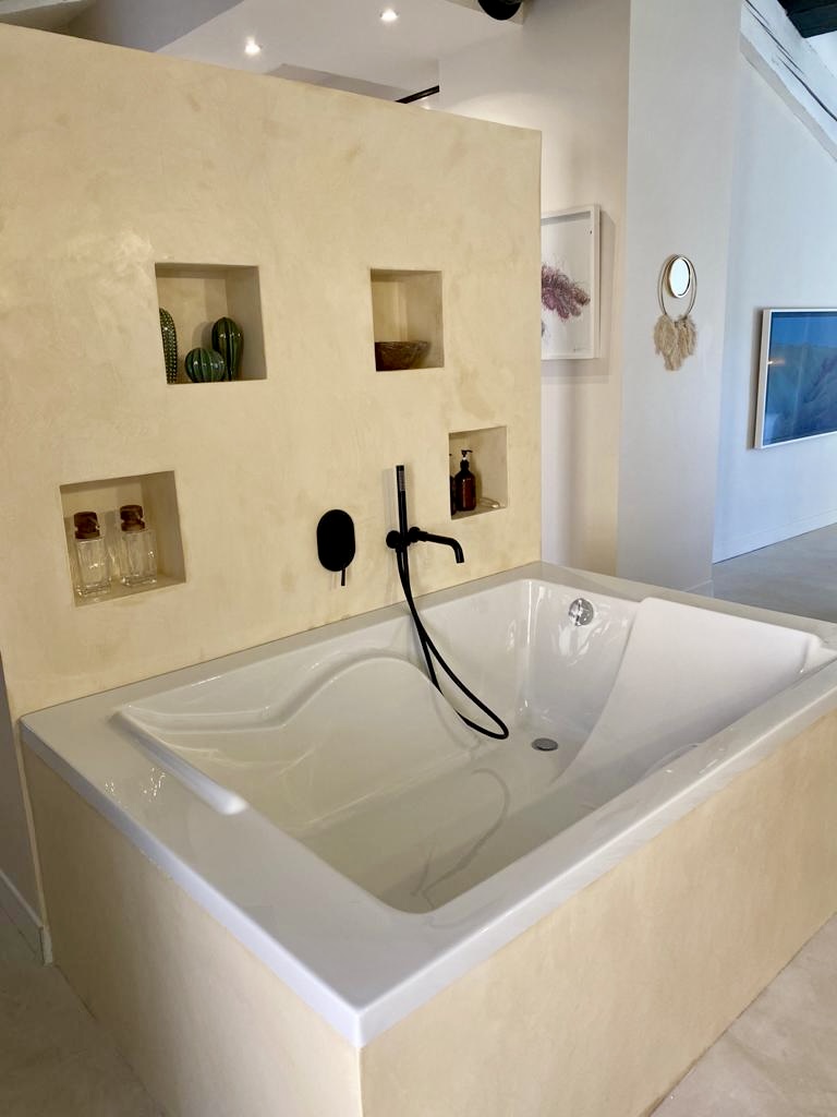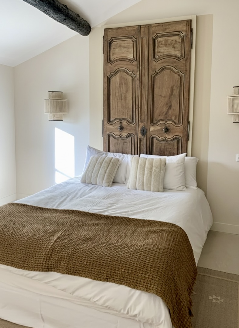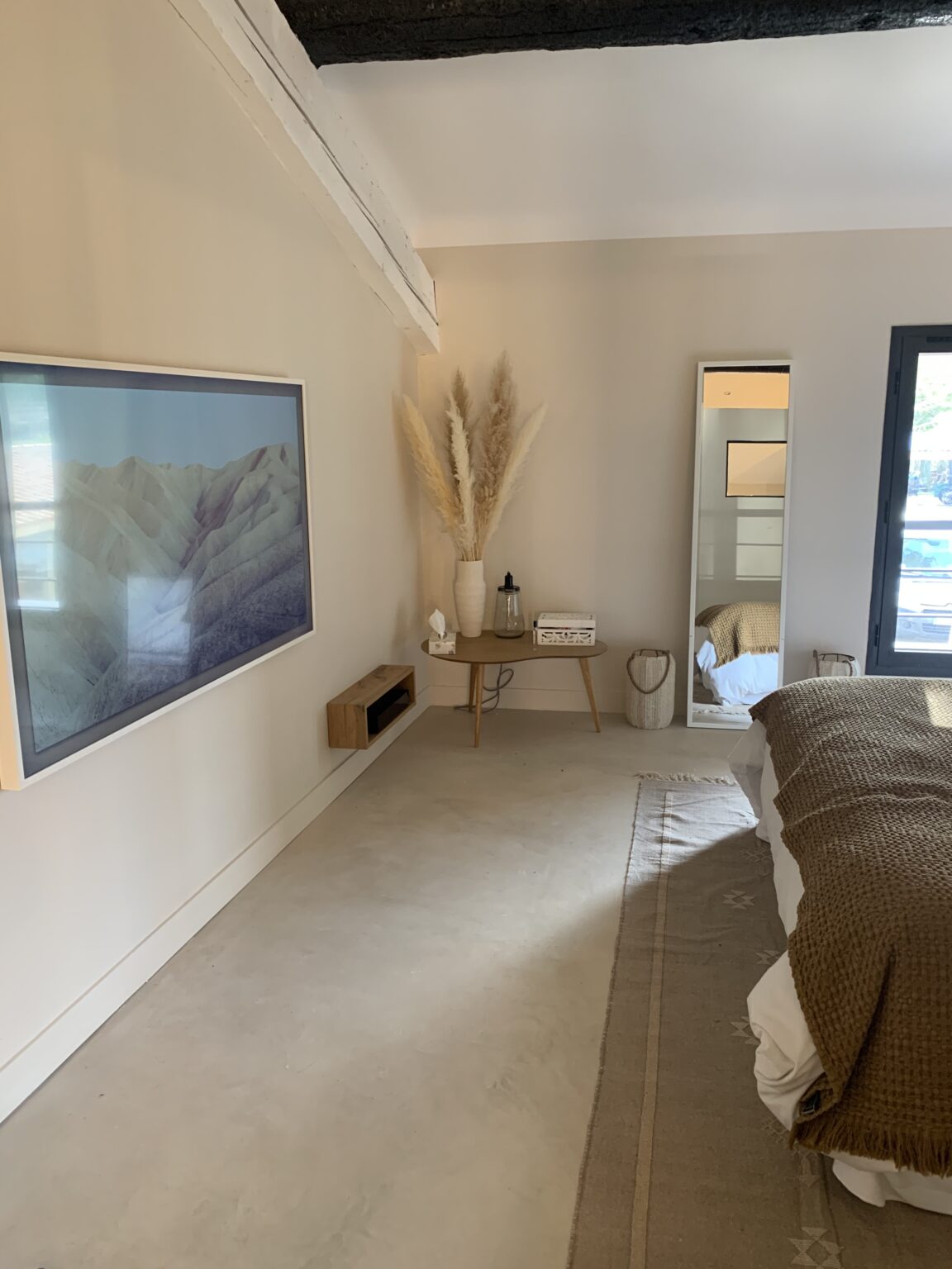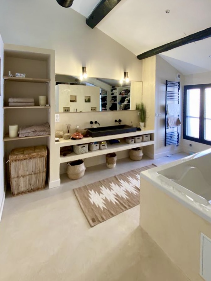 Ce projet met en valeur une demeure de caractère à travers une approche sensible et authentique. La suite parentale se transforme en un véritable cocon minéral, habillé de murs en tadelakt aux teintes sablées, en parfaite continuité avec un sol en béton ciré. Dans le séjour, la structure existante a été sublimée par une réinterprétation de la cheminée : le foyer prend place sous une voûte magistrale restaurée, soulignant avec force la verticalité et le caractère du volume.