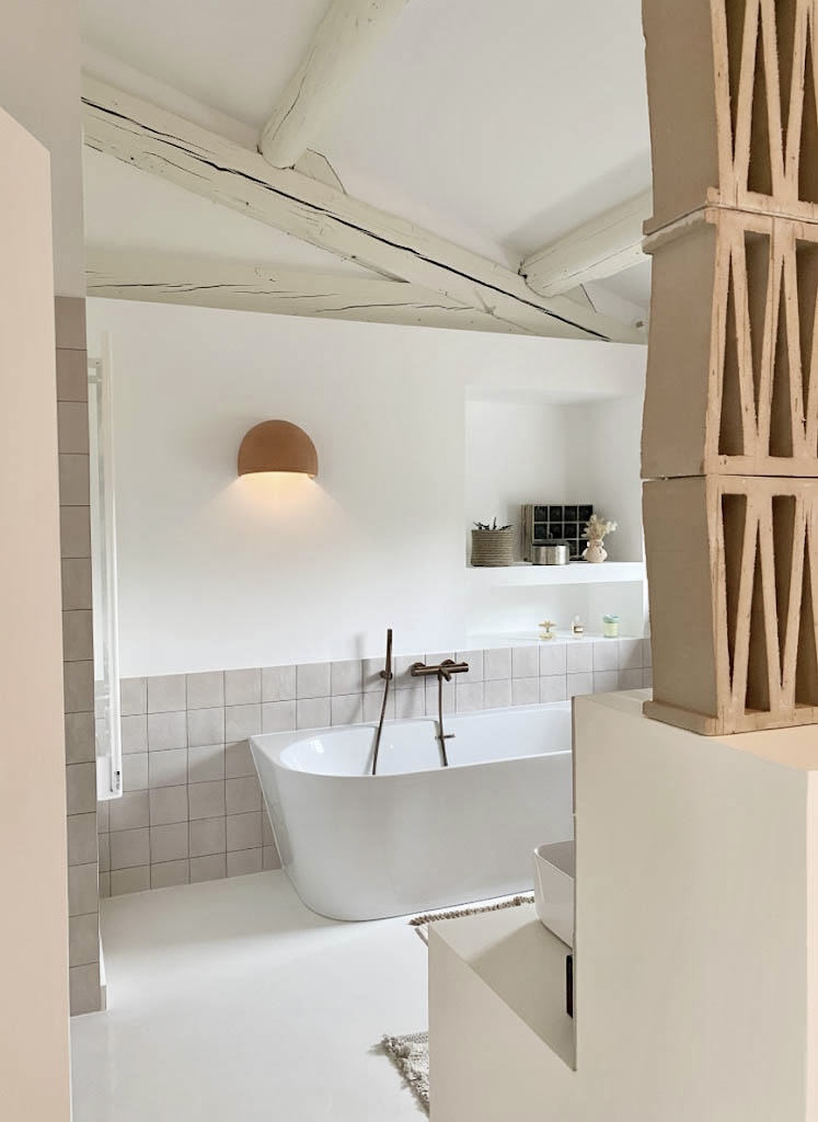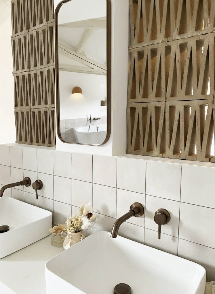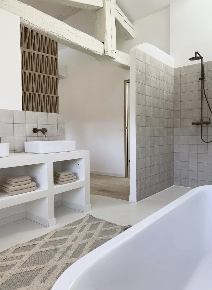 Ce projet raconte la transformation de deux chambres en une suite parentale spacieuse et lumineuse. La recomposition des volumes crée un espace nuit ouvert et harmonieux, intégrant une salle de bain délicatement structurée par des éléments architecturaux aux lignes arrondies. Les matériaux naturels, les claustras en terre cuite, le béton ciré et les poutres apparentes préservées confèrent caractère et douceur à cet ensemble pensé comme un refuge élégant et intemporel.