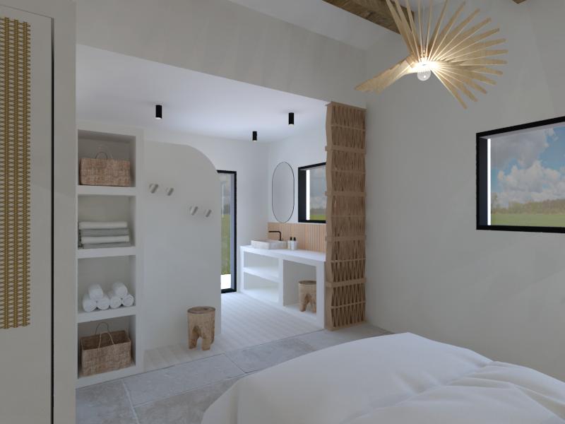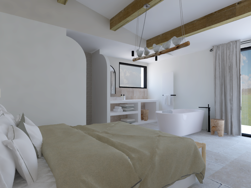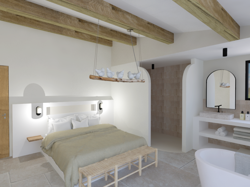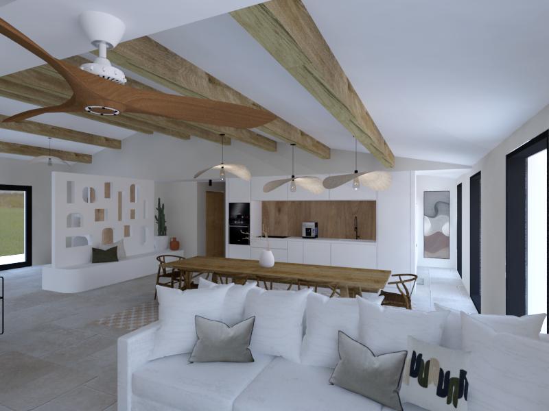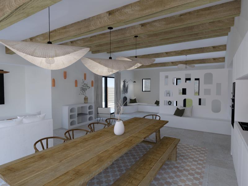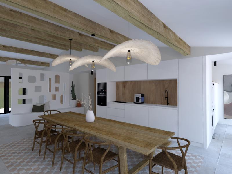 Ce projet raconte la transformation d’une coque brute, autrefois dédiée aux écuries, en une maison de vacances destinée à la location saisonnière haut de gamme. Le projet a été pensé comme un lieu convivial et généreux, articulé autour d’un vaste séjour avec cuisine ouverte, de deux suites parentales et d’une chambre d’enfants, le tout dans une ambiance inspirée du style mallorquin. Ayant moi-même passé de nombreuses vacances aux Baléares durant mon enfance, ce projet a immédiatement résonné en moi et nourri mon inspiration.