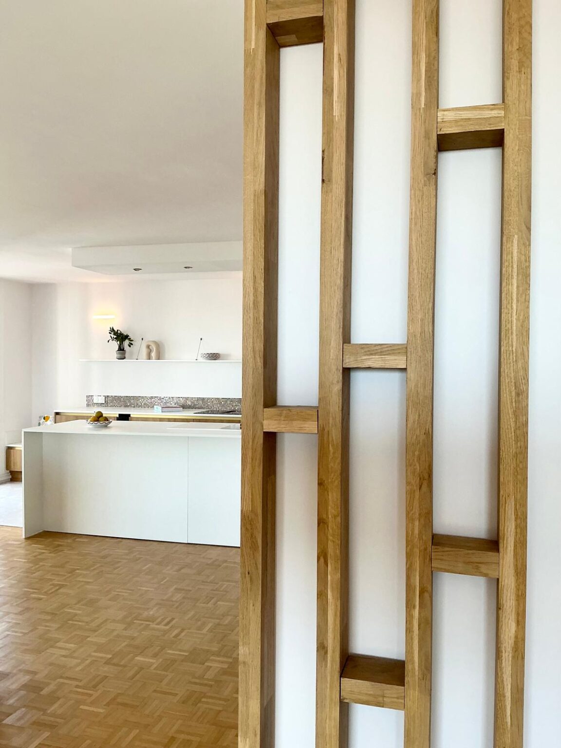 Ce projet d'aménagement sur-mesure est né de l'histoire d'un jeune couple charmé par Marseille et son mode de vie. Pour transformer leur nouvelle acquisition en un foyer idéal, ma mission a consisté à optimiser l'agencement pour intégrer une chambre supplémentaire. J'ai également procédé à la rénovation complète de la cuisine et de la salle de bain, tout en rafraîchissant le parquet d'origine pour lui conférer un style actuel et lumineux. Mon rôle a été d'imaginer, de dessiner ce nouvel espace de vie et de garantir la qualité des travaux, de la première esquisse à la livraison.