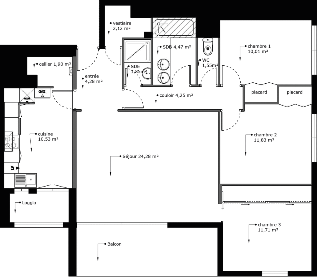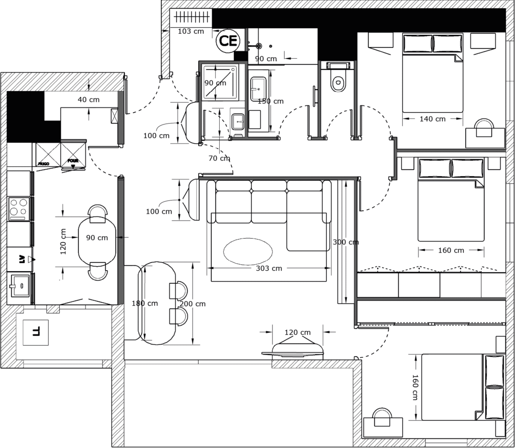 Ici, nous définissons la fonctionnalité. Sur ce plan coté, chaque centimètre est optimisé. Nous avons retravaillé les circulations, notamment l’espace cuisine et le salon, en veillant à respecter des largeurs de passage fluides (ex : 90 cm, 100 cm). L’objectif est de créer une base technique irréprochable pour la vie quotidienne.