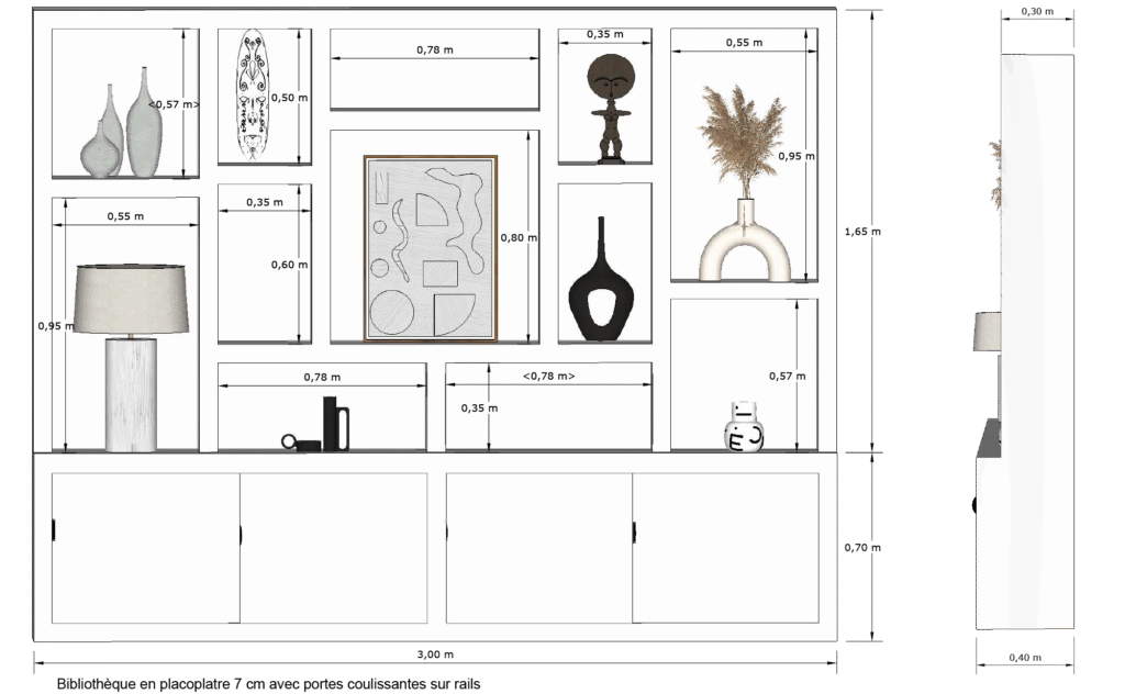 Retour à la précision technique pour la réalisation. Ce plan d’élévation de la bibliothèque en placoplatre (7 cm d’épaisseur) est le guide pour l’artisan. Chaque niche est calibrée pour vos objets (0,55 m, 0,78 m) et intègre des portes coulissantes sur rails pour une finition épurée et fonctionnelle.