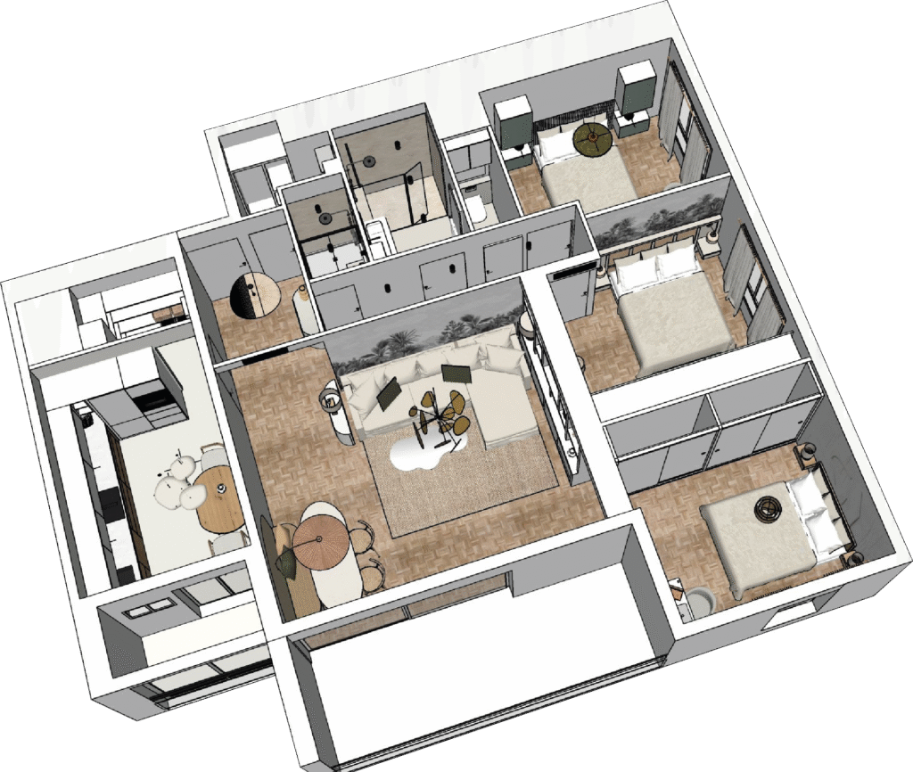 Cette vue en « maison de poupée » permet de comprendre la cohérence globale de l’appartement. On visualise l’équilibre entre les zones nuit et les zones jour, et comment la lumière traversera l’ensemble de l’espace restructuré.