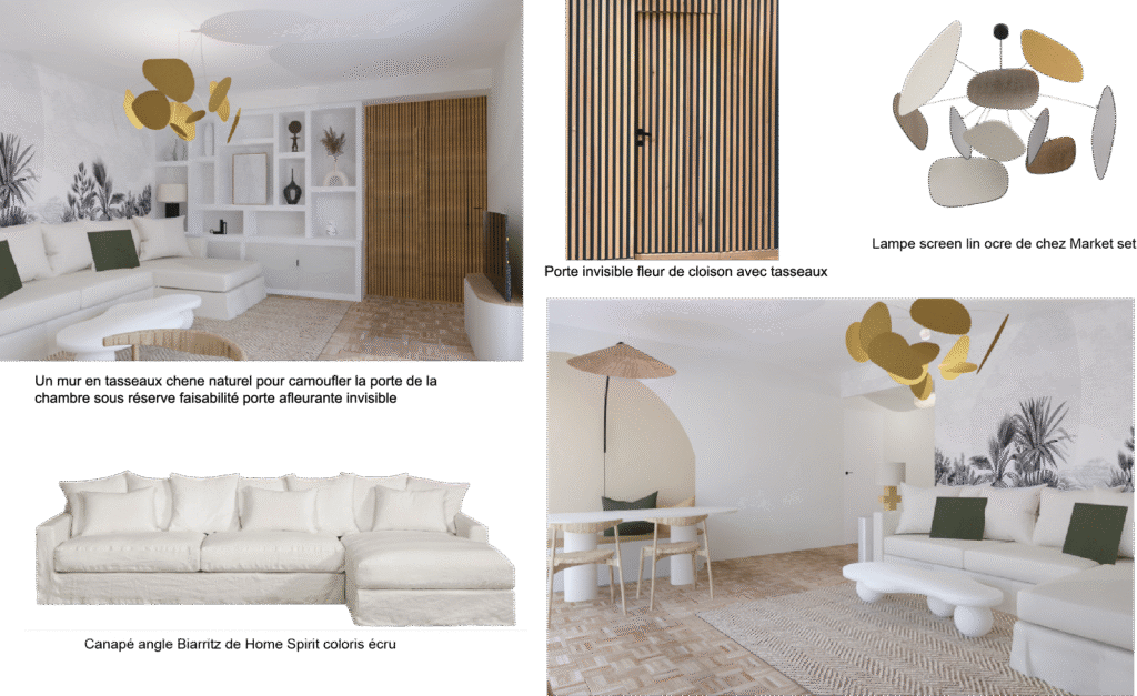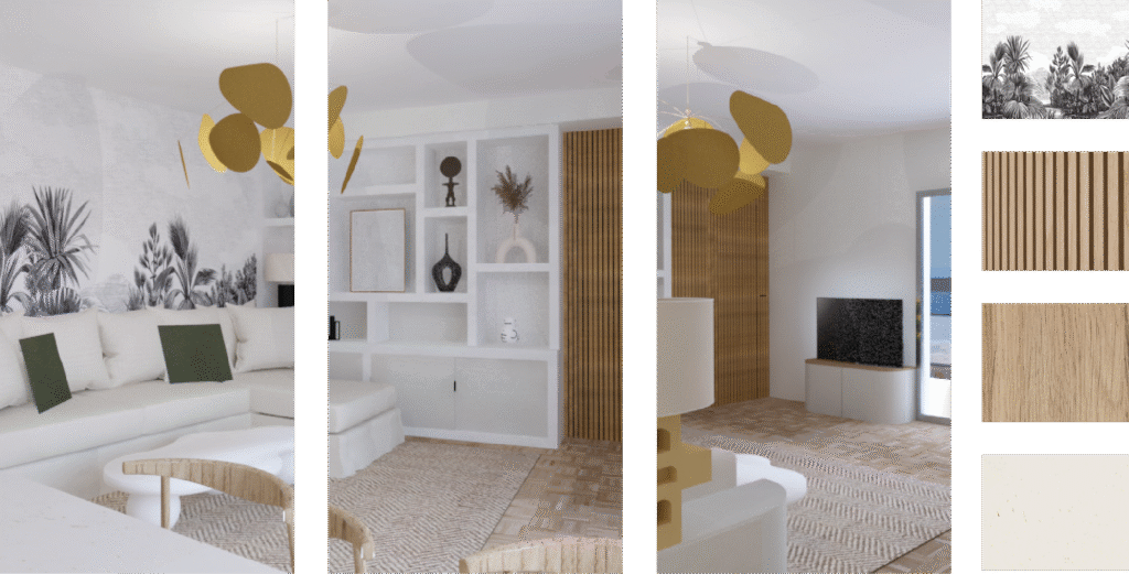 C’est l’étape de l’émotion. Nous sélectionnons les matériaux qui toucheront vos sens : un papier peint panoramique aux motifs végétaux pour la profondeur, associé à des tasseaux en chêne naturel pour la chaleur et l’acoustique. C’est la signature esthétique du projet.