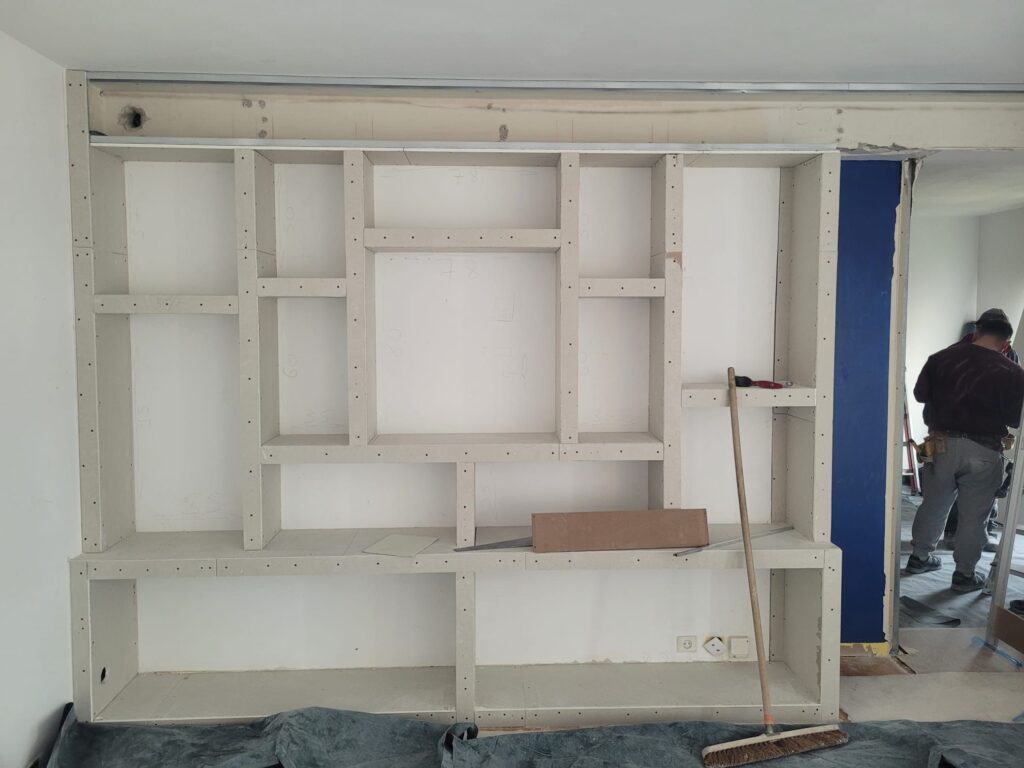Avant d’accueillir vos objets d’art, la bibliothèque n’est qu’une ossature précise. Ici, nous veillons au respect strict des cotes définies sur le plan d’élévation. L’utilisation de placoplatre de 7 cm d’épaisseur n’est pas un hasard : c’est elle qui donnera cette impression de maçonnerie solide et pérenne, tout en permettant l’intégration parfaite des rails pour les futures portes coulissantes.